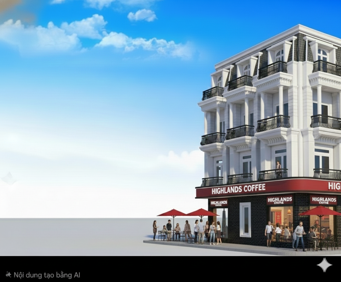 Phối cảnh 3D (căn góc) của 1 trong 3 căn trong gói mua sỉ giả định đang kinh doanh cafe (được tạo bởi AI dựa theo thiết kế 2D)